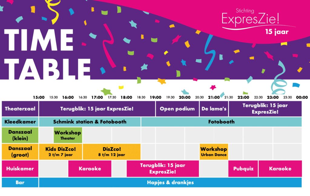 Van 15:00u tot 00:00 worden er verschillende activiteiten georganiseerd in meerdere ruimtes van de ExpresZie! Loods. We zullen dansen, zingen, acteren en meer. En natuurlijk blikken we terug op mooie herinneringen van de afgelopen 15 jaar!